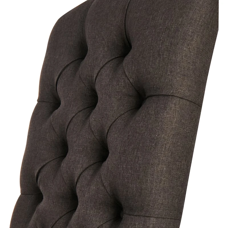 A collection that lets everyone relax in style. Polished finishes and classic hues pair with fun finds. Providence is where elegant settings still feel comfortable and warm�exclusively At Home. Our stylish Amina dining chair has a high, simple curved and button tufted back and studs that wrap around a foam-filled seat cushion for a soft dining spot. The whole chair is upholstered in a charcoal grey fabric, and the dark stained legs create a fab accent for the design. With no arms, this chair can sit snug against your table for a buttoned-up appearance.